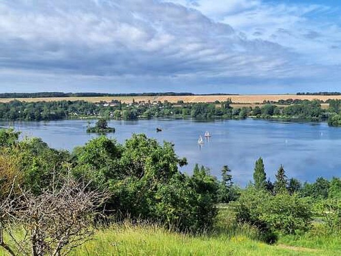 Suivre le chemin à droite qui grimpe à flanc de coteau. En haut de la côte, continuer tout droit [point de vue sur le plan d’eau et la vallée], puis longer le bois sur 200 m.